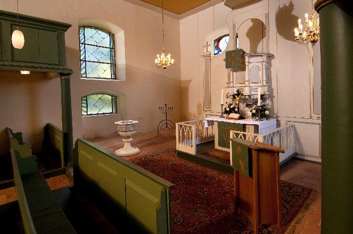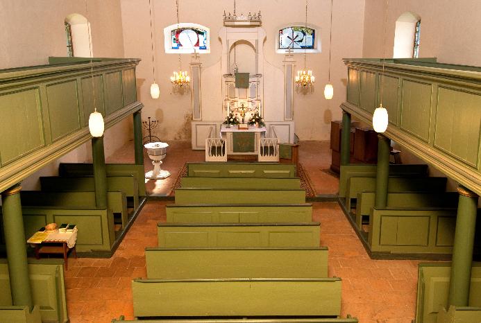 Im Innenraum hat die Kirche eine flache Putzdecke.